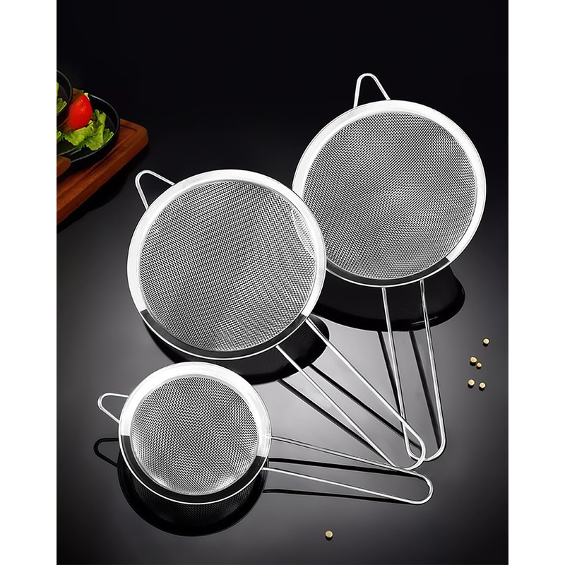 Versatile For Use: Small medium large size sifter metal strainer set, whether you need to drain, strain or sieve then you will achieve excellent results with our kitchen strainers. For kitchen rice, juice, quinoa, food, flour, baking, vegetables, tea, rinsing fruits, straining pasta, noodle, salad, gravy, coffee, colander, fryer, skimmer, drainer etc.