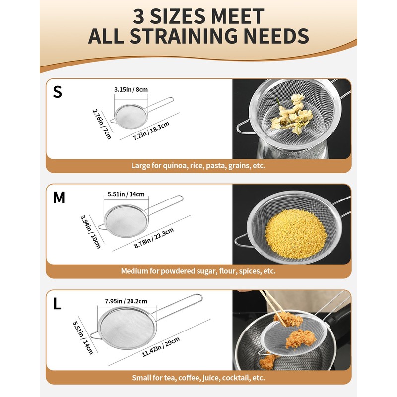 - 3 MOST POPULAR SIZES: 3.15" strainer for tea, quinoa or coffee, 5.5" strainer for powder sugar, cocoa powder, and 7.95" strainer for quinoa, pasta, A kitchen must have all your straining, sieving, sifting, filtering and rinsing tasks