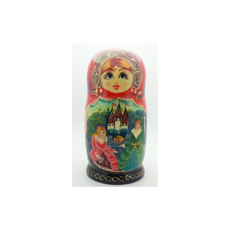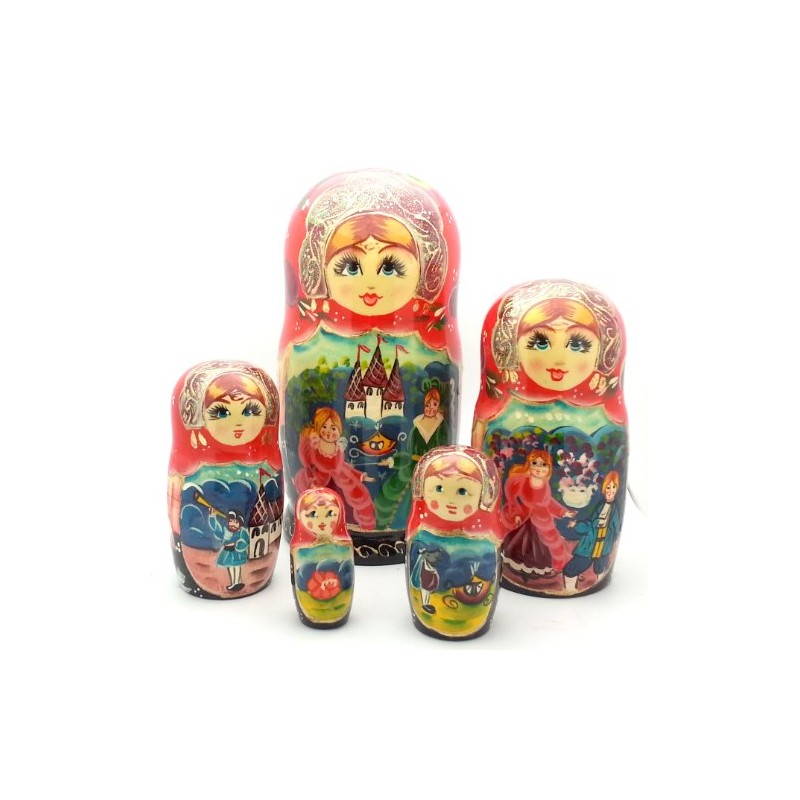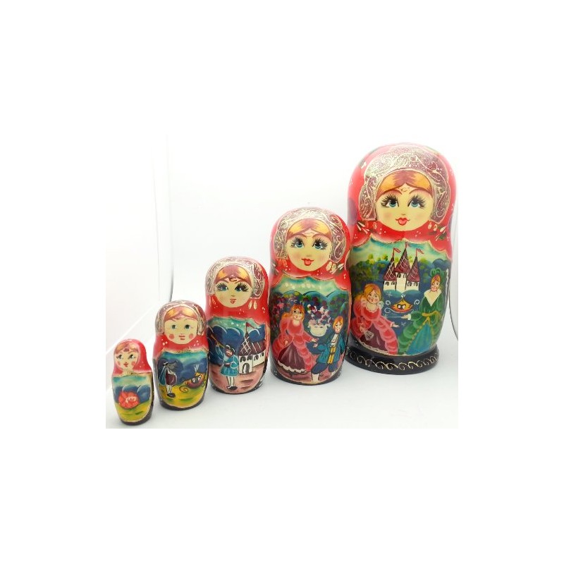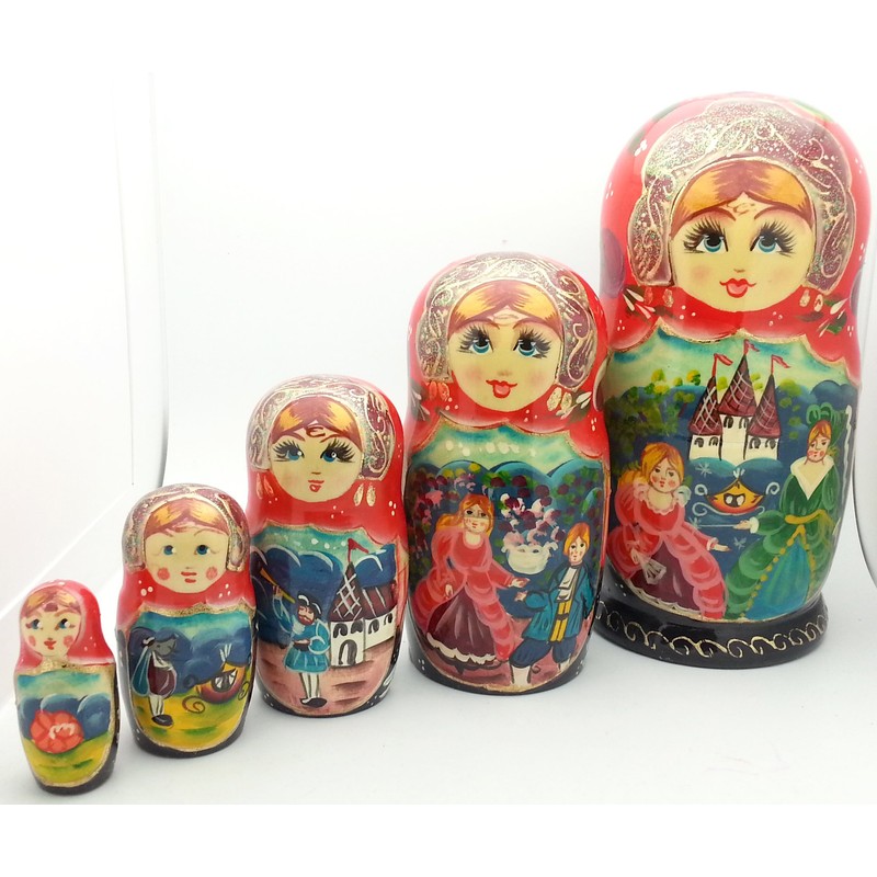 This hand-painted matryoshka set tells the story of the classic fairy tale Cinderella. The story is illustrated on this lovely five-piece hand-painted set. Each doll in the set shows a different scene from this famous fairytale. This hand-painted 5 piece set has a glossy lacquered finish and is signed by the artist.