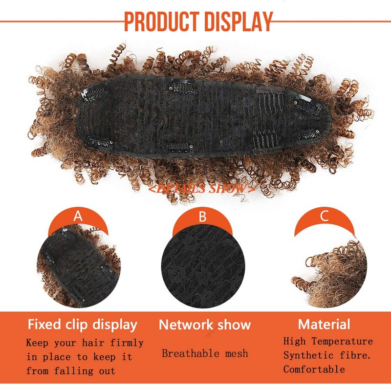 **Product description** Hair Type: Mohawk hairstyles Hair Material: High quality heat resistant synthetic hair, natural, not shiny Hair Quantity: 1 Piece Package:1*Afro kinky curly ponytail hair extensions with bangs+1*Eyelash A natural hair Mohawk is not only fun to wear, it’s fun to admire, too! This style allows your curls to go wild while still maintaining style and control. **How to wash?** Under normal circumstances, it is best not to wash. If you wash, you don't need to wash frequently, but you need regular maintenance and maintenance. **1.Wash the hair by shampoo and conditioner with softer. **2\. Don't use hair drier,it cause the hair dry and tangled. **3.Don't use fine-tooth brush or comb,it cause the hair shedding. ****Keep your Mohawk on natural hair looking genuinely natural with a free and flirty feel that will quickly win hearts. Pair it with some oversized accessories and enjoy a style that’s not only beautiful, but super simple to maintain, too. ****Tip:** The quality of our wigs is good enough and the density is thick enough to meet your various needs for wigs. If you have any problems with your purchase, please contact us in time, we will try our best to help you, thank you. ************