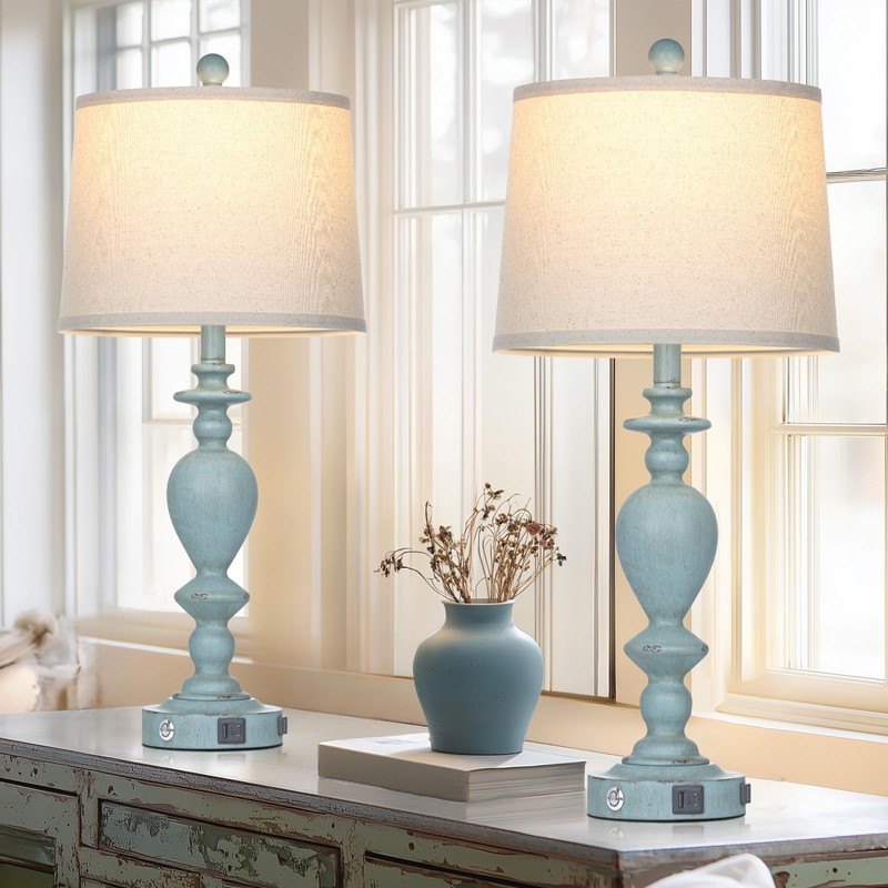 Cinkeda 27.5" Coastal Table Lamp for Living Room Set of 2,Retro Blue Bedside Nightstand Lamps with USB C+A Ports & AC Outlet,3-Way Dimmable Touch Control Desk Lamp for Bedroom