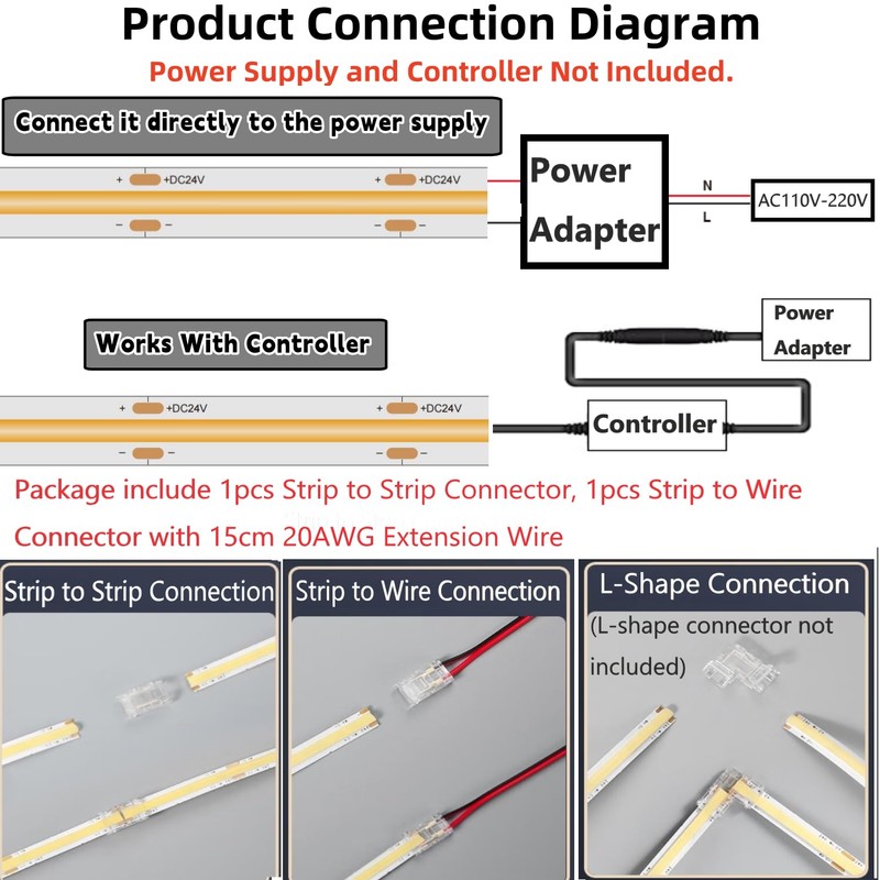 - Specifications: Length: 16.4ft/5m; Board width: 8mm; Input voltage: DC 24V; 9W/m ; Lumen: 320+ lm/ft; LED chips: 2400 LEDs/reel(480LEDs/m); CRI(Ra): 90+; IP20rating(indoor use only ); Cuttable every 1.96inch(50mm); Packing list: 1 x 16.4FT COB LED light strip , 1 x non-wired solderless connectors, 1 x connector with extension wire and 1 x user manual(Note: Power supply and dimmer is not included in the package.)