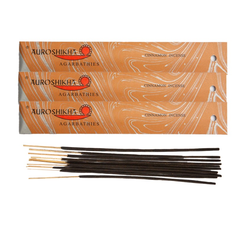 - Auroshikha Marbling ~ Cinnamon ~ A warming and clearing scent of cinnamon bark with traces of sweet almond. ***** Now also available as multipacks for a better value ***** Incense made by Auroshikha is regarded as some of the finest incense in the world. Auroshikha has captured the light, delicate fragrances of nature, lovingly made at the Sri Aurobindo Ashram in Pondicherry.
