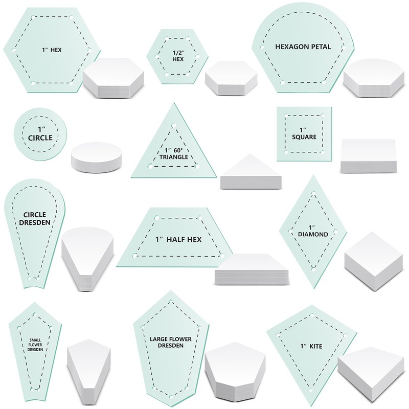 Cinnvoice 612 Pcs Patchwork Paper Piecing Supplies 12 Shapes Acrylic Patchwork Templates Set with 600 Pcs Paper Piecing for Sewing Dresden Plate Triangle Hexagon Quilting Template (Light Green)
