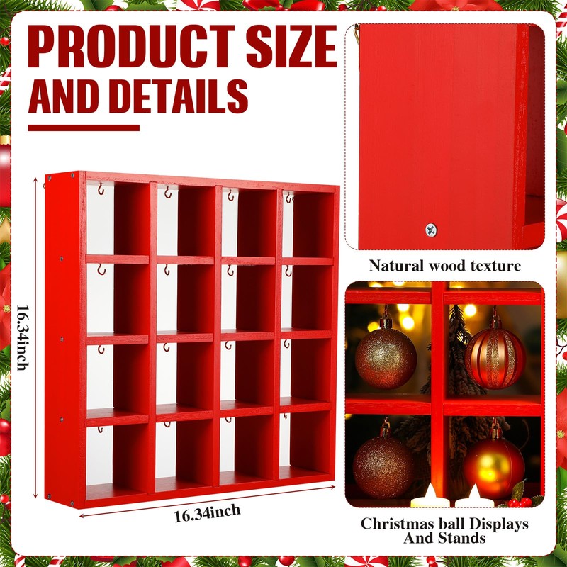 Cinnvoice Wooden Christmas Ornament Displays Rack, 16" x 16" Hanging Red Stand Holder Hanger with 16 Compartments for Christmas Ball, Display Shelf Cabinet for Craft Bauble Decorations Gift