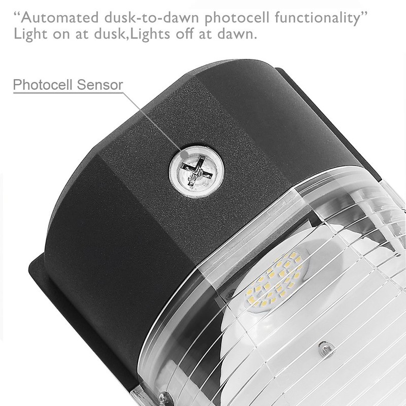 - Outdoor wall lantern come with automated dusk-to-dawn photocell functionality. Light off at sunrise/daytime and light on at sundown/night. Die-casting of aluminum housing with clear lens, anti-corrosion, Waterproof IP65, 5000K daylight for Outdoor illumination.