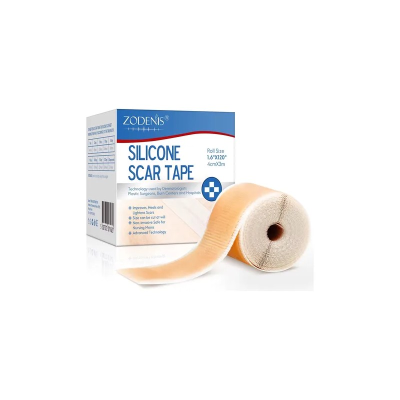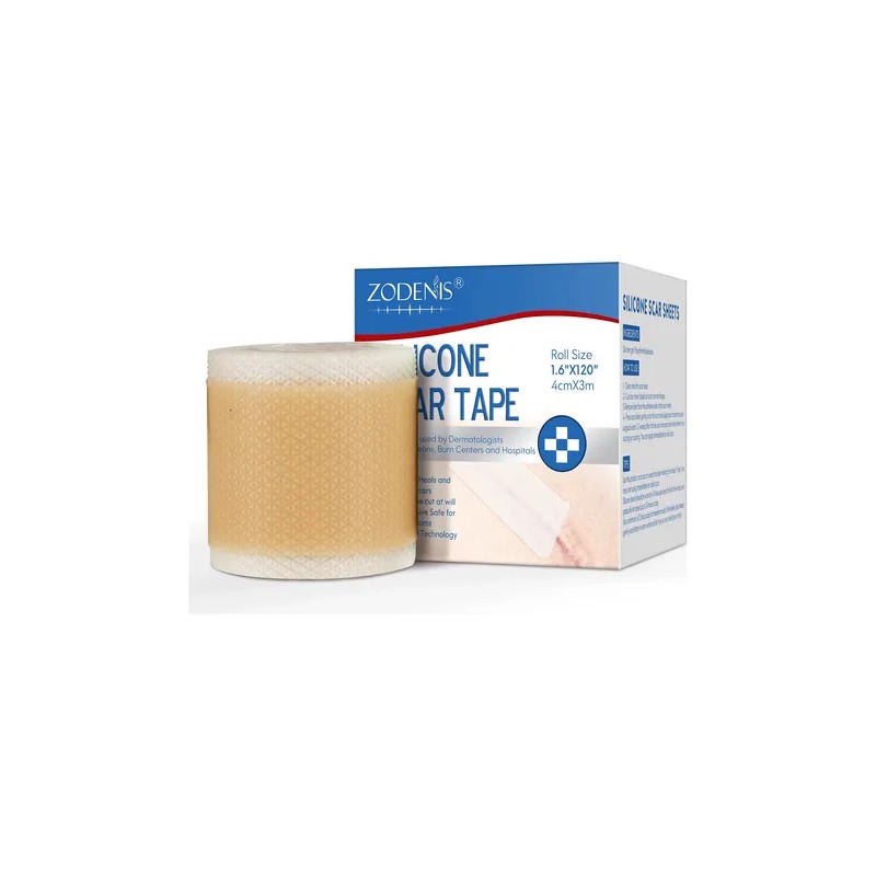 La cinta de silicona Zodenis es un producto médico diseñado para reducir la apariencia de cicatrices, incluyendo las causadas por cesáreas, cirugías, quemaduras, acné y queloides. Esta cinta, disponible en rollos de 1.6” x 120” (4 cm x 3.3 m), es reutilizable y flexible, adaptándose a diversas áreas del cuerpo.