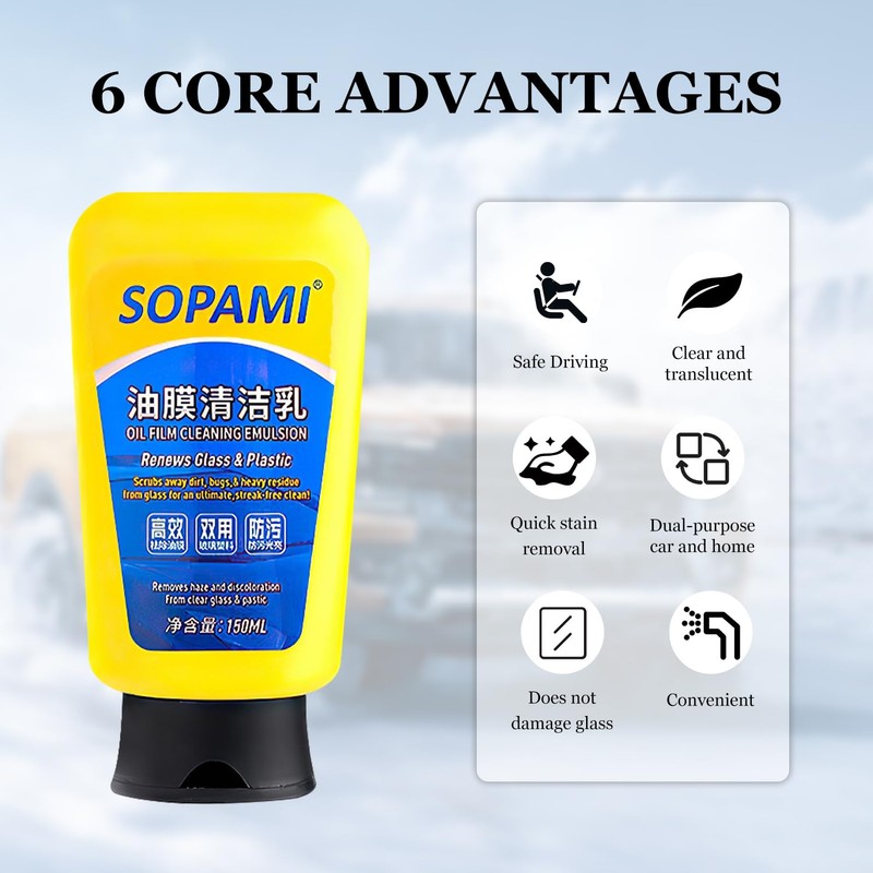 - 【Defogging and Anti-Fog】Sopami oil film emulsion glass cleaner has the function of defogging and anti-fogging, window cleaner can effectively prevent the glass surface from fogging after cleaning, and form a protective layer on the surface of the glass,preventing water stains,dirt,and fog, and maintaining clarity and transparency