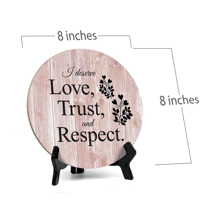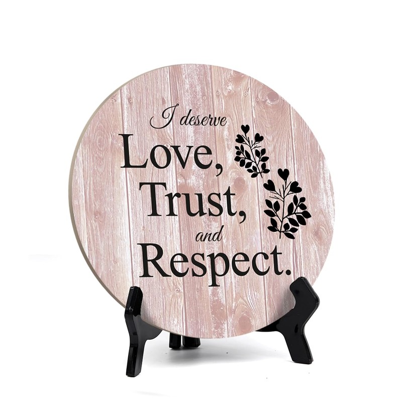 - I Deserve Love, Trust and Respect Circle Table or Counter Sign made out of quality MDF hardboard with black easel stand.