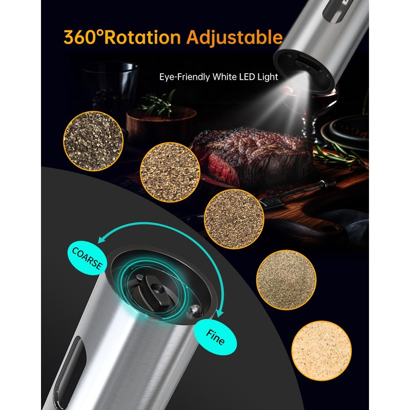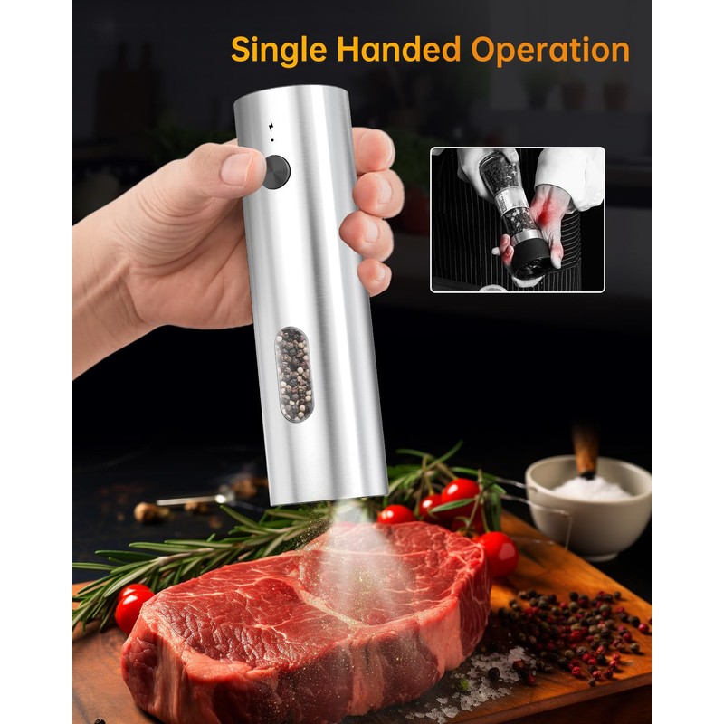 - Great Quality with Elegant Design - Crafted from food-grade, BPA-free materials, this stylish stainless steel pepper mill set elevates any kitchen. The ergonomic CD-textured button ensures easy, one-touch operation, ideal for everyone from kids to seniors. Perfect for indoor cooking and outdoor adventures alike