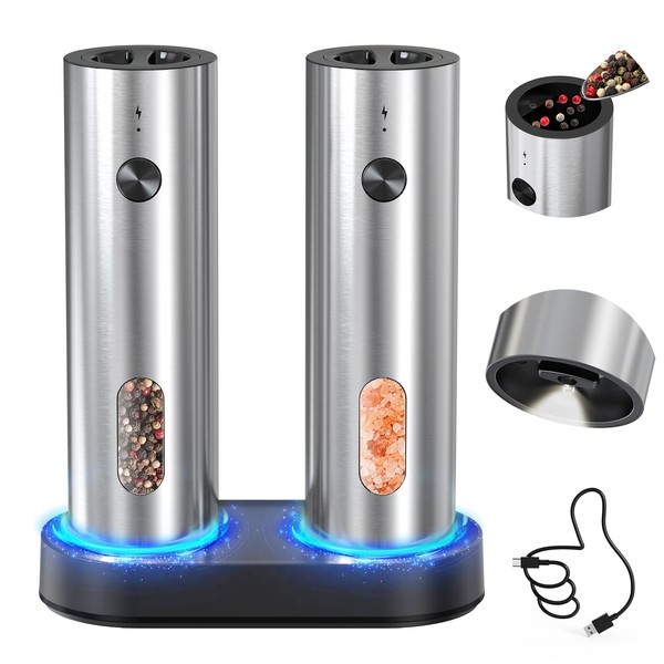CIRCLE JOY Rechargeable Electric Salt and Pepper Grinder Set Automatic Stainless Steel Pepper Mill Grinders with Charging Base, Adjustable Coarseness, 110ml Container and Bright LED Light, Silver