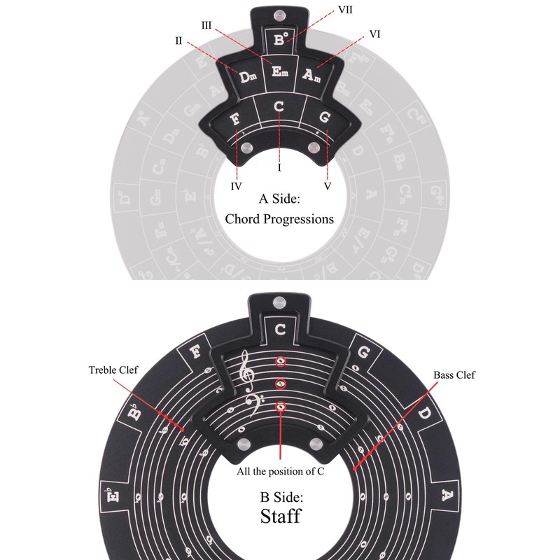 - 2.Effective learning tool: Circle of Fifths Wheel is chord structure,A-side is chord progressions, B-side is musical staff, which can help you quickly master music theory and songwriting.