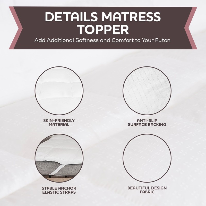 • FUTON MATTRESS TOPPER: The Futon Mattress Topper is the extra added comfort your Futon has been in need of. Let CirclesHome change the reality of your Futon Topper by adding an extra needed layer of comfort and softness.