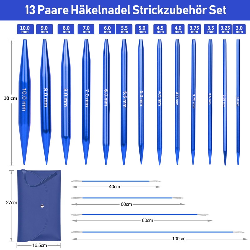 - Complete set for all needs: with 13 different sizes of interchangeable needles (3.0 - 10.0 mm) and 4 cables of different lengths (40 - 100 cm) as well as stitch markings and end caps, this knitting accessory set is ideal for all your knitting projects. Whether a beginner or an expert, all your daily knitting needs are perfectly covered here
