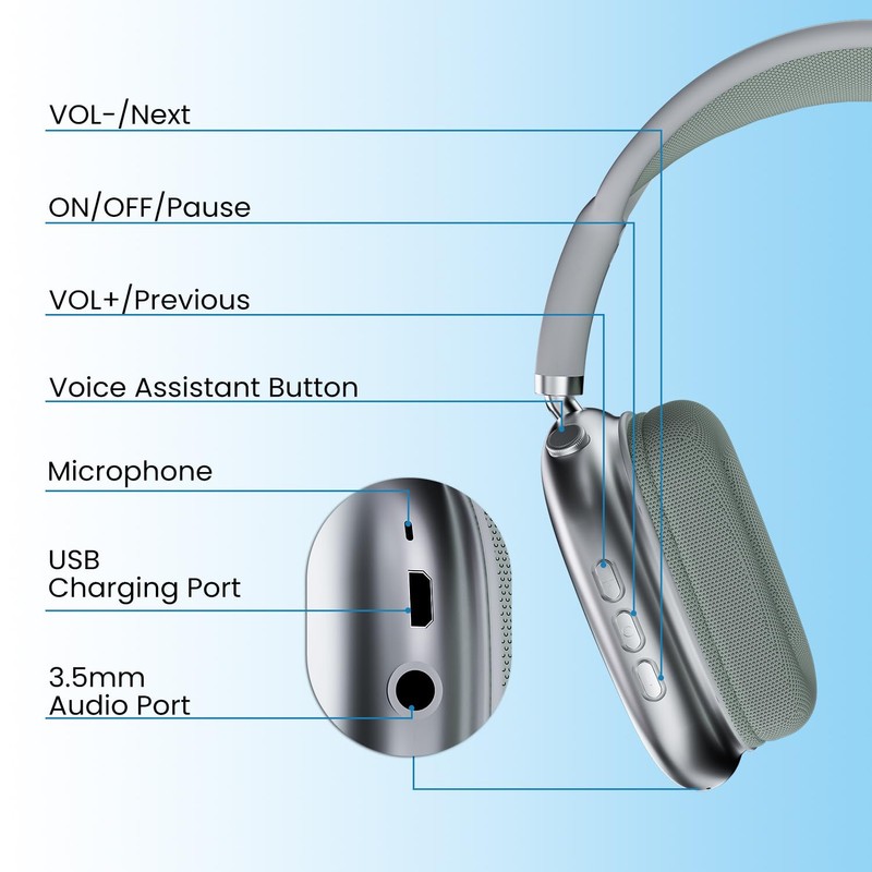 CIRICO HM05 BaseTone Wireless Over-Ear Headphones with Mic, 20H Playtime, Deep Bass, Bluetooth 5.3, Foldable Lightweight for Home Office, Travel, Cellphone, PC, Sliver