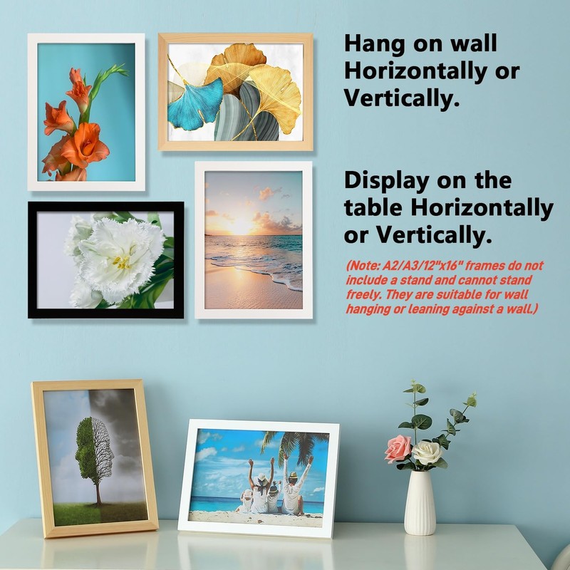 - Flexible Sizing : Available in various sizes. (Please note that only pictures smaller than 12x16 have a stand for freestanding. To hold the picture in place, the front visible size is slightly smaller than the picture size.)