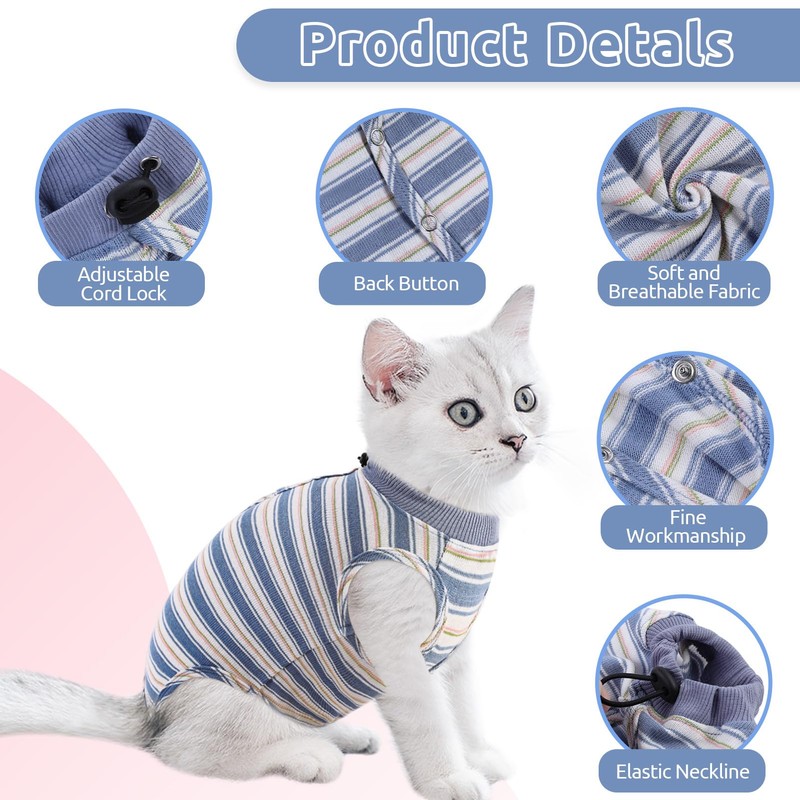 - Easy to put on and take off: The cat bodysuit after op castration cat has an elastic neckline and a snap design that is comfortable and not tight, easy to wear, adapts to the skin and does not deform after washing. The adjustable drawstring and snap closure at the neck allow for a custom fit and adaptability to different body shapes and sizes.