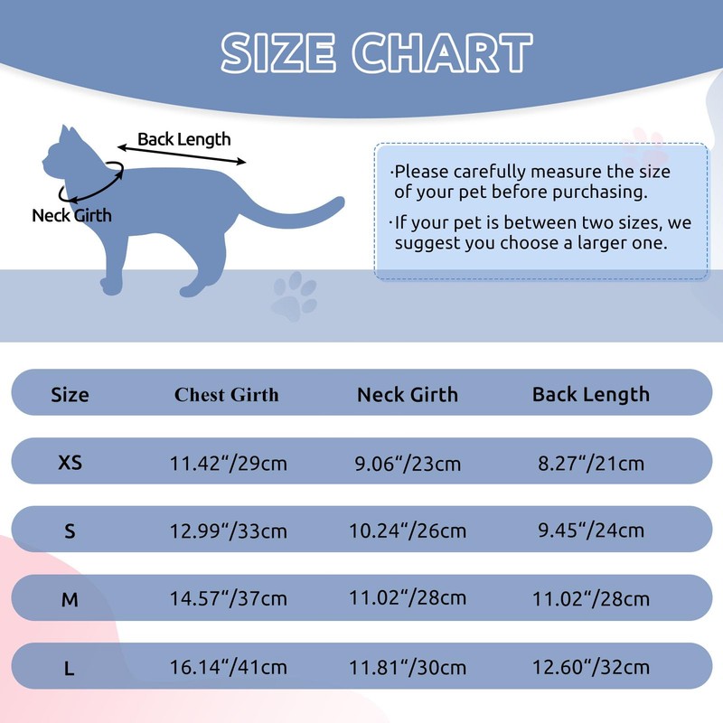 - Product size: Our cat bodysuit for cat surgery is available in two colours pink and blue as well as in four sizes XS, S, M and L. XS: Neck: 23 cm, Chest circumference: 29 cm, Back Length: 21 cm; S: Neck circumference: 26 cm, Chest circumference: 33 cm, Back length: 24 cm; M: Neck circumference: 28 cm, Chest circumference: 37 cm, Back length: 28 cm; L: Neck circumference: 30 cm, Chest circumference: 41 cm, Back length: 32 cm. Please measure your cat's back length before purchasing.