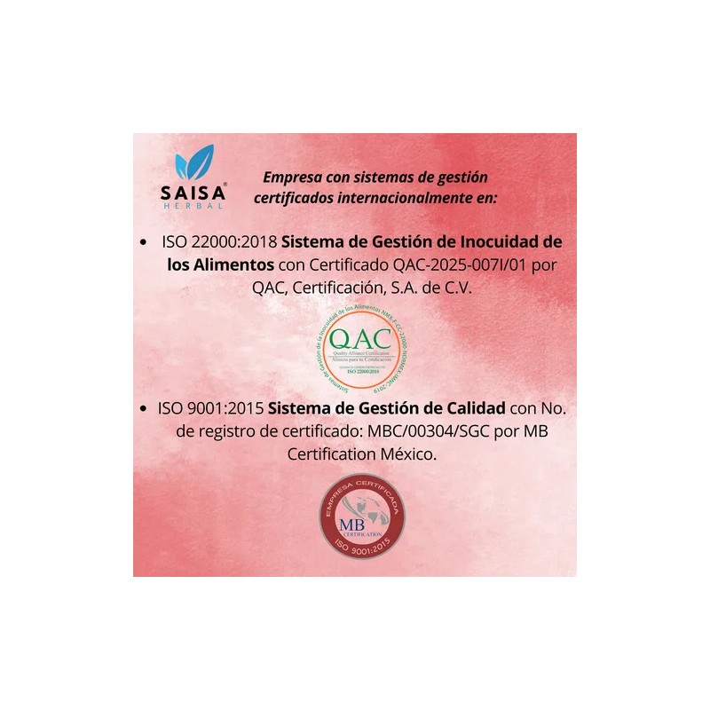 Nuestra empresa cuenta con dos décadas de experiencia en el mercado de productos naturales y estamos comprometidos con la calidad, avalada por la certificación ISO 9001 2015.