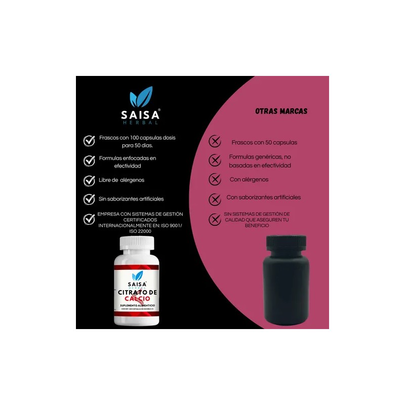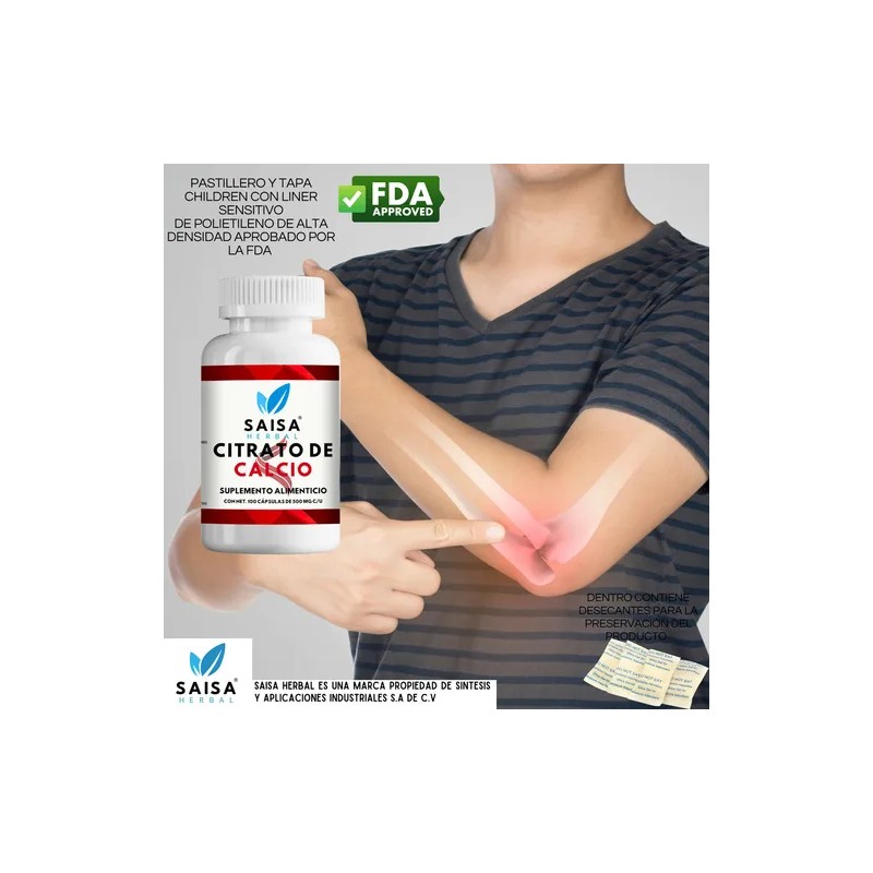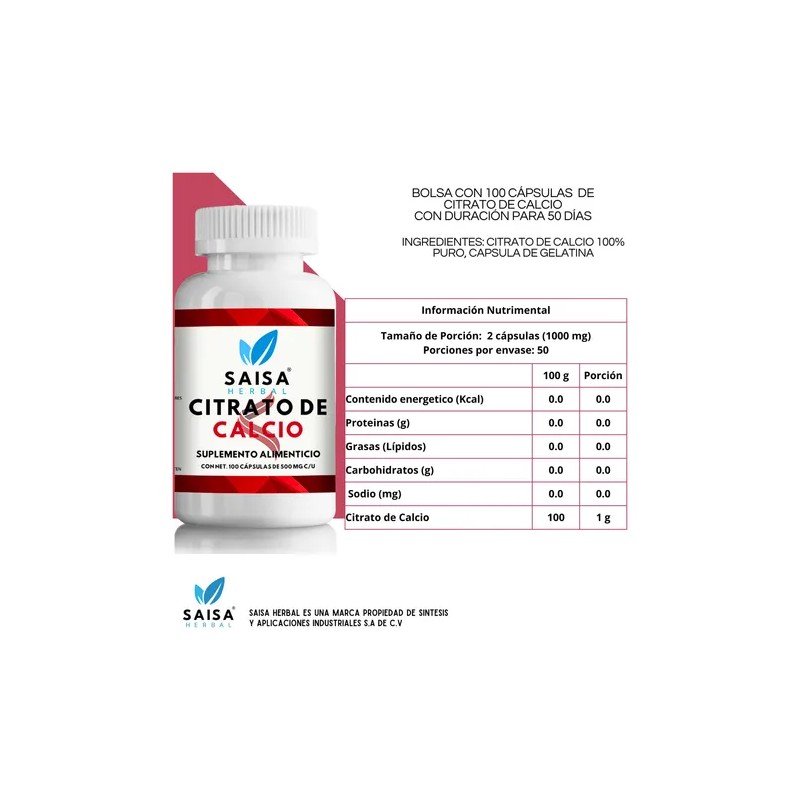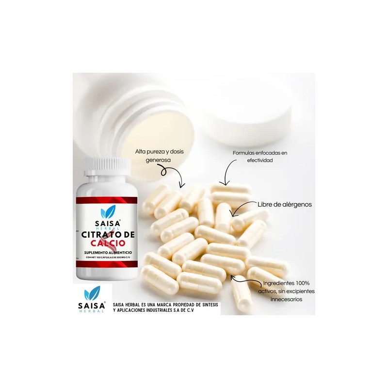 Citrato de Calcio 100 Cáps | Suplemento Alimenticio | Saisa Herbal | Huesos Fuertes, Articulaciones y Dientes | Mejor Absorció