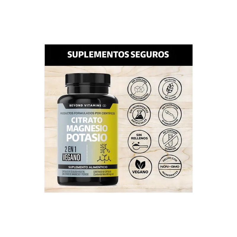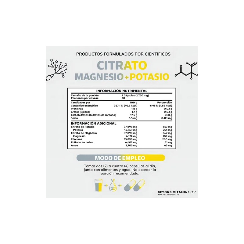 Citrato de Magnesio + Potasio Beyond Vitamins contiene una combinación de 2 Citratos: Citrato de Magnesio y Citrato de Potasio. Además, contiene Platano en polvo, curcuma y arroz. Sin rellenos. Nuestro producto son el resultado de investigación y estrictos estándares de control de calidad. Es ideal para hombres, mujeres y personas mayores. Nuestro Citrato de Magnesio + Potasio es libre de lácteos, soya, hormonas, antibióticos, conservantes, azúcar, colorantes y sabores artificiales. Es VEGANO.