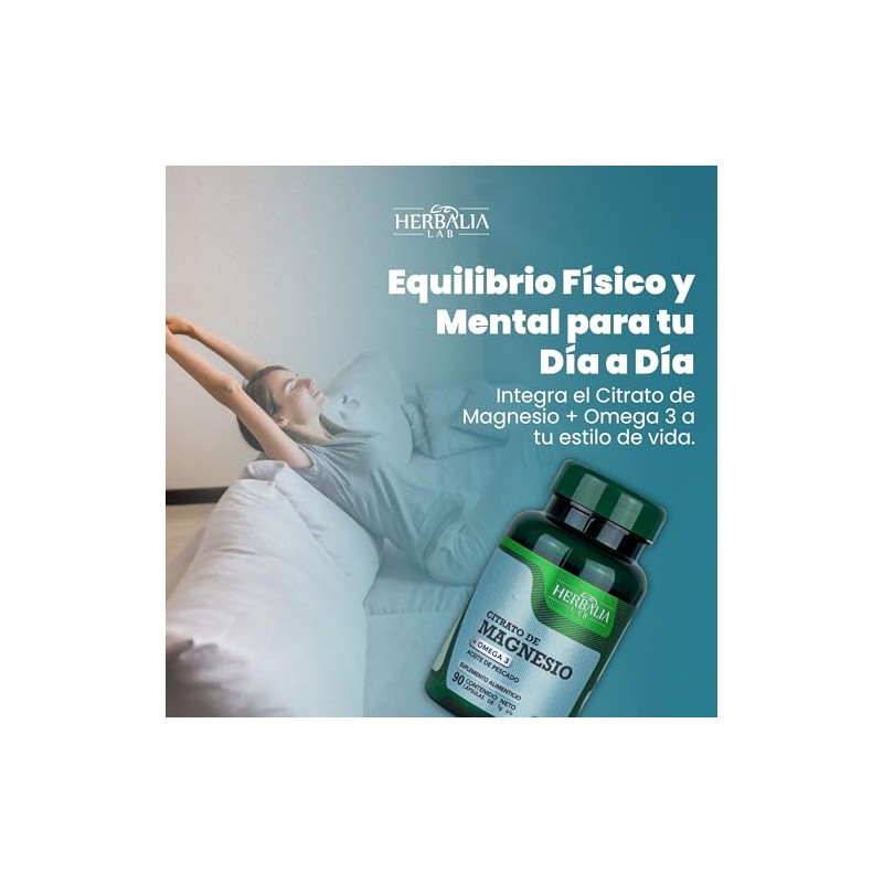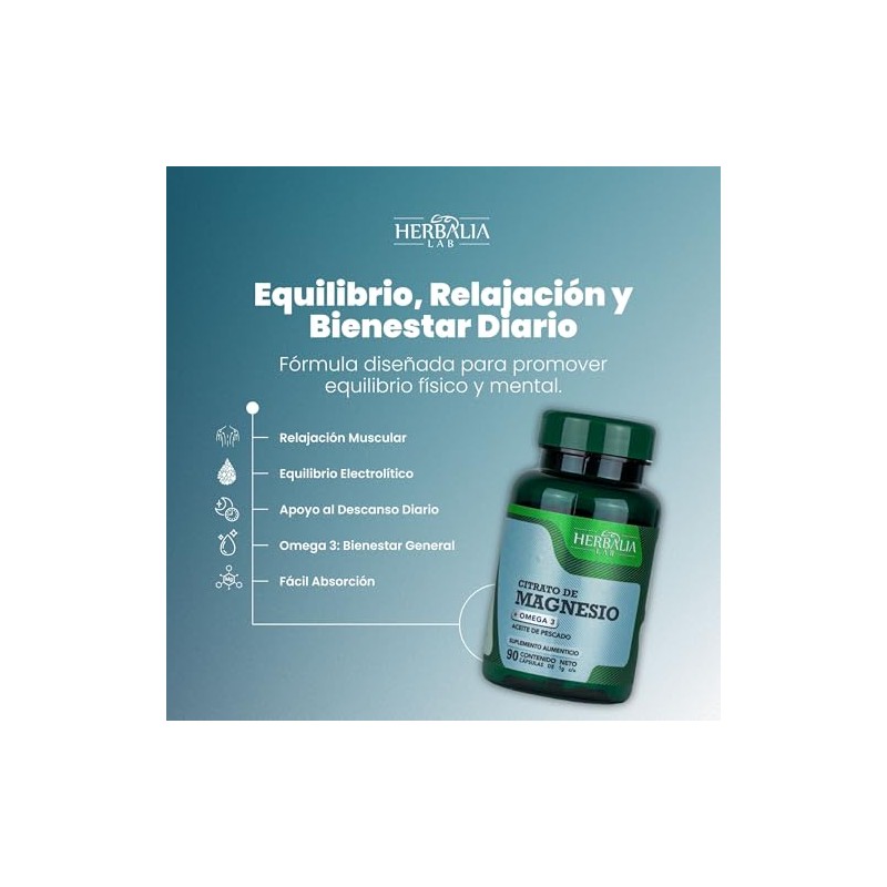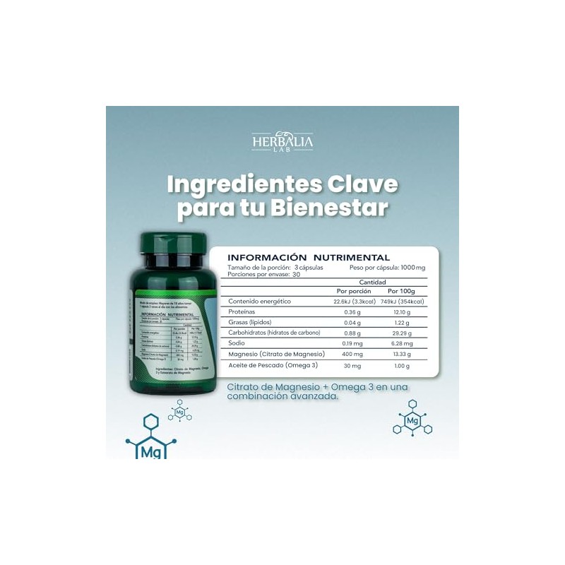 Citrato de Magnesio con Omega 3 - Magnesio Ultra Absorbente - Apoyo Muscular y Cognitivo - Magnesio de Alta pureza - 90 Cápsulas 400 mg Herbalia Lab