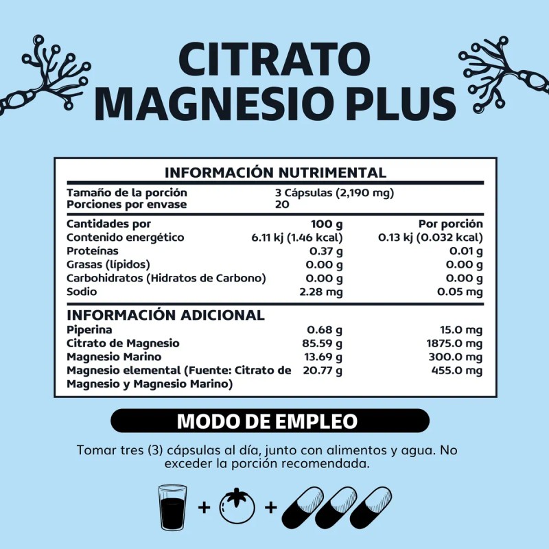 Citrato De Magnesio Plus Con Piperina - 60 Cápsulas Sin Sabor