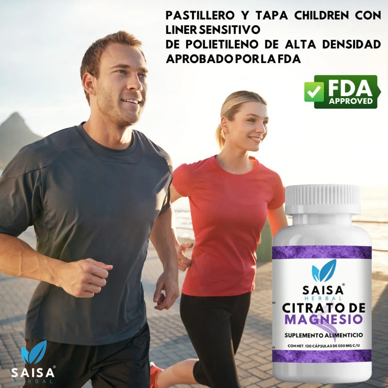 - El citrato de magnesio es un suplemento popular de magnesio con varios beneficios para la salud. Algunos de los más destacados incluyen: Beneficios del Citrato de Magnesio Mejora la digestión y alivia el estreñimiento Tiene un efecto laxante suave, ayudando a regular el tránsito intestinal. Favorece la relajación y reduce el estrés Ayuda a disminuir la ansiedad y mejorar el estado de ánimo. Promueve un mejor sueño Relaja el sistema nervioso y facilita el descanso. Apoya la función muscular y reduce calambres Es esencial para la contracción y relajación muscular. Contribuye a la salud ósea Ayuda en la absorción de calcio y la densidad ósea. Mejora la función cardiovascular Regula la presión arterial y mantiene el ritmo cardíaco estable. Favorece la producción de energía Es clave en la producción de ATP, la principal fuente de energía del cuerpo. Citrato De Magnesio Puro Con 120 Cápsulas De 500 Mg C/u es un suplemento alimenticio diseñado para contribuir a una vida más saludable. Este producto, de la reconocida marca Saisa Herbal, se presenta en un práctico frasco que contiene 120 cápsulas, cada una con un peso de 0.5 g. El Citrato de Magnesio es un mineral esencial que apoya diversas funciones corporales, siendo especialmente beneficioso para el sistema muscular y nervioso. Este suplemento es libre de gluten y no contiene lactosa, lo que lo convierte en una opción adecuada para personas con restricciones dietéticas. Además, es importante destacar que este producto no es vegano y está recomendado para adultos a partir de 18 años. Con un enfoque en la calidad, todos nuestros productos son elaborados bajo estrictos estándares reglamentarios, garantizando así su efectividad y seguridad. Aporta a tu bienestar con Citrato De Magnesio Puro. Aviso legal