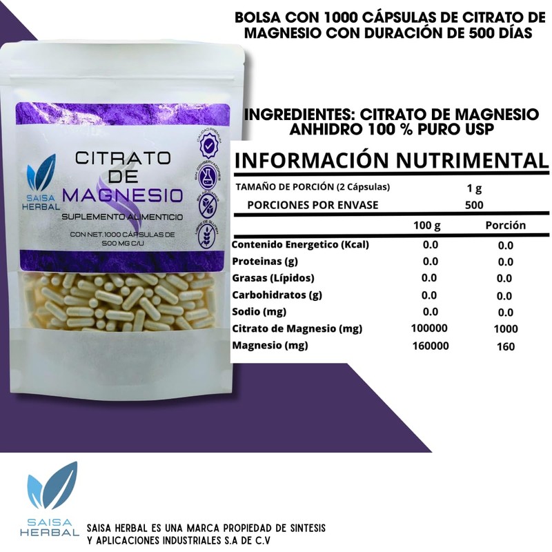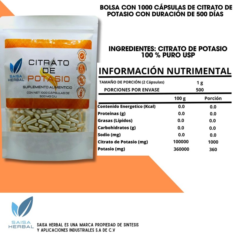 Citrato De Magnesio Y Citrato De Potasio 1000 Cápsulas C/u. SAISA HERBAL
