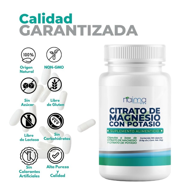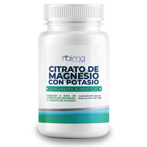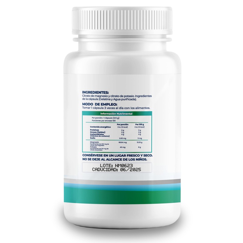 Citrato de Magnesio y Citrato de Potasio en Cápsulas - 100 capsulas, 400 mg de citrato de magnesio y 100 mg
