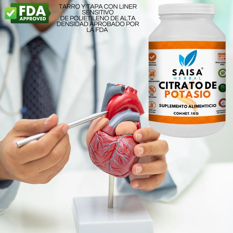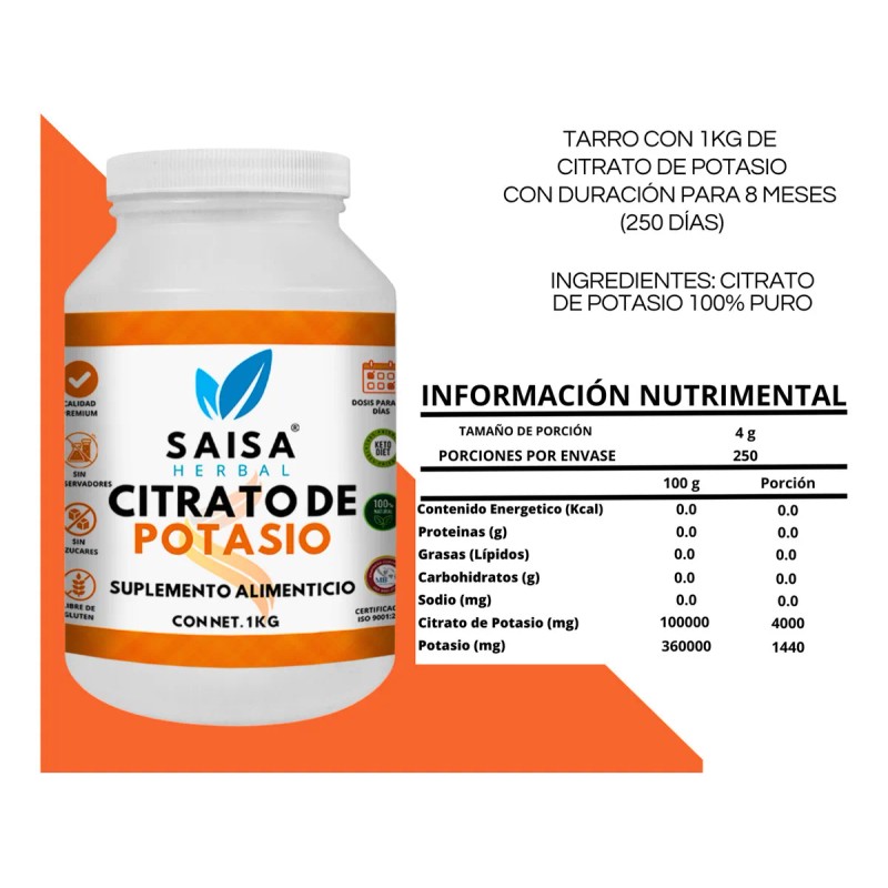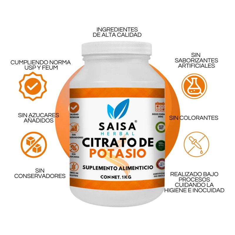 - Citrato De Potasio 1 Kg. Este producto no es un medicamento. El consumo de este producto es responsabilidad de quien lo usa y recomienda. Los suplementos de SAISA HERBAL, junto a una buena alimentación y ejercicio, son el complemento ideal para una vida más saludable. Este suplemento alimenticio, es una opción nutritiva y efectiva. Es libre de gluten y no contiene lactosa, lo que lo hace apto para personas con estas restricciones dietéticas. Además, es importante destacar que este producto es nuevo y se presenta en un práctico envase tipo bolsa, garantizando su frescura y calidad. Con un peso neto de 1 kg, es perfecto para quienes buscan mejorar su bienestar general. Recuerda que la edad mínima recomendada para su uso es de 18 años. El citrato de potasio es un suplemento y medicamento utilizado principalmente para corregir niveles bajos de potasio y para tratar ciertas condiciones médicas. Algunos de sus beneficios incluyen: 1. Prevención y tratamiento de cálculos renales