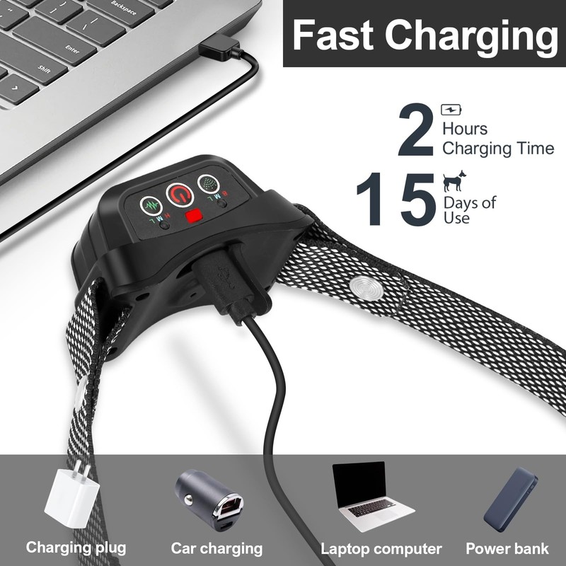 - Rechargeable & IPX67 Waterproof: The barking collar built-in battery, rapid charge only needs 1.5~2.5 hours for 10 days of regular use. IPX67 Waterproof suit for daily life such as light rain or wet lawn. Don't soak it in the water such as swimming or bathing