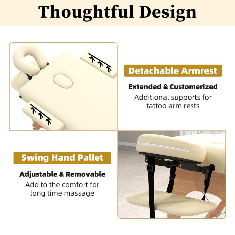 - Customizable Accessories: This professional massage table comes with an adjustable face cradle with a soft face cushion, a hanging hand pallet, a pair of armrests, and a storage pocket. All accessories are removable and designed to ensure a good user experience.