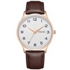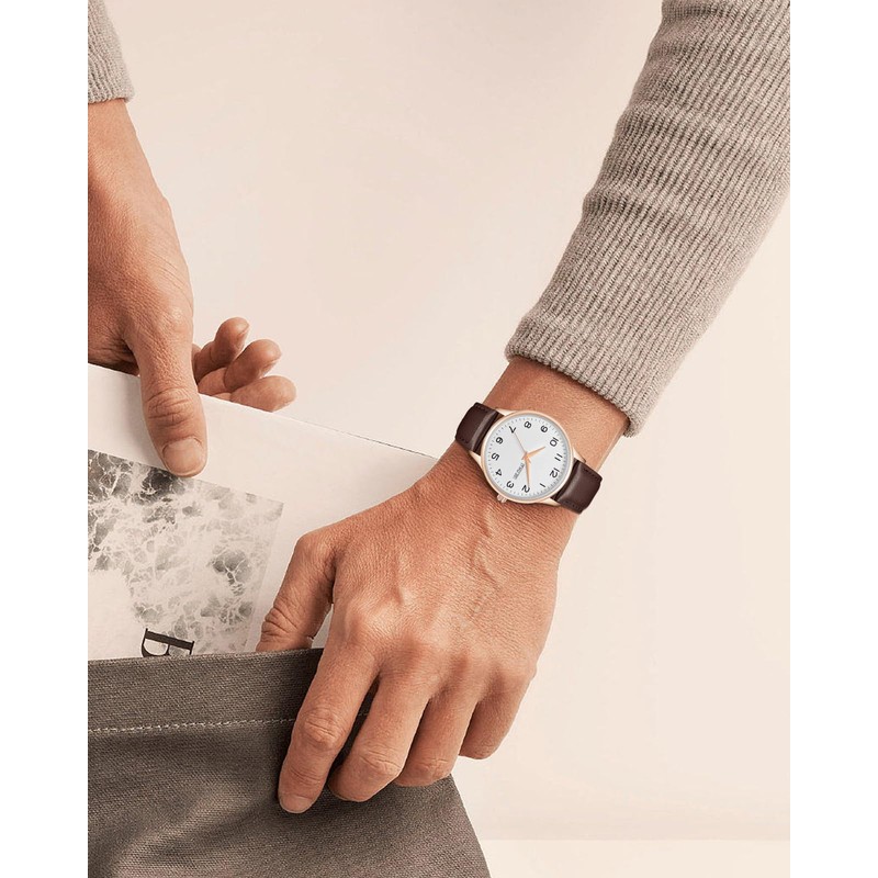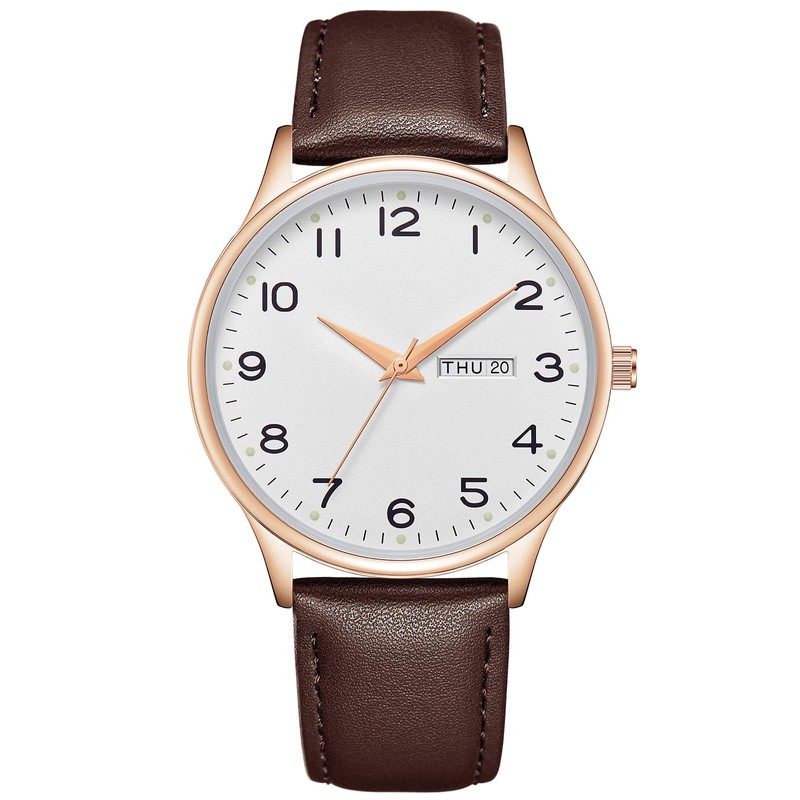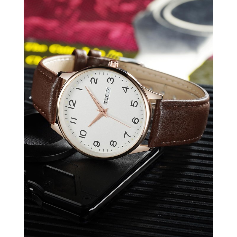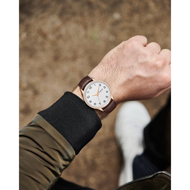- Classic Design - 3-hand dial with date and day window, easy-to-read Arabic numerals. 40mm case and black/brown leather strap.