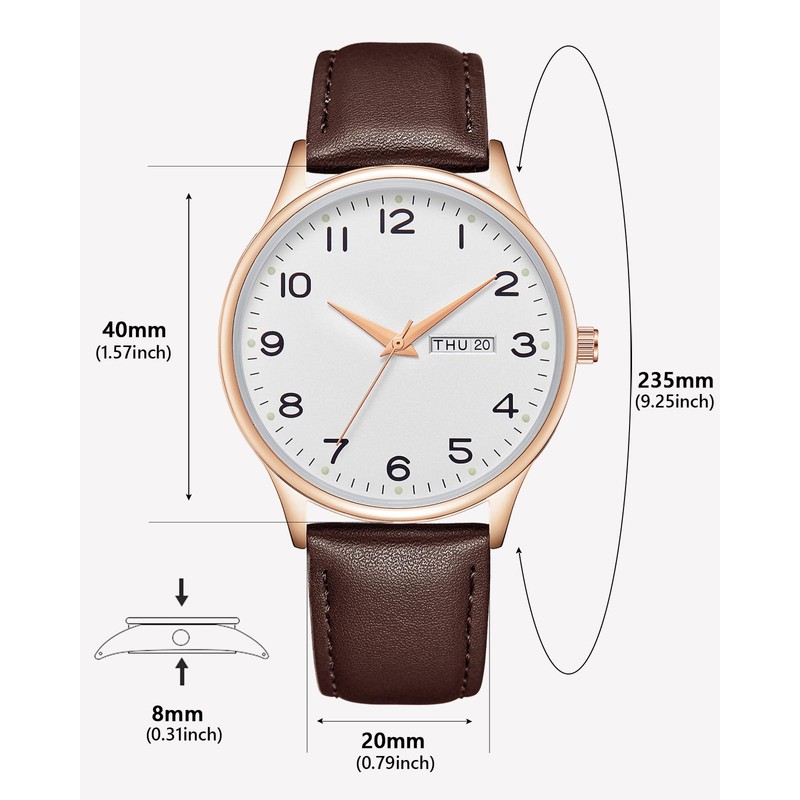 - Premium Quality - Soft leather strap with a total length of 23.5cm, which can cover various male wrist sizes. Lightweight and comfortable for all-day wear. Japanese quartz movement provides accurate timekeeping. 3atm water resistance.