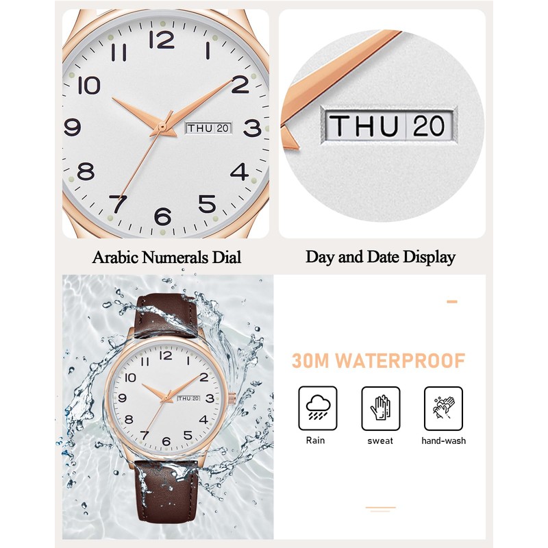 12 hours display, Arabic numerals, day and date, fashion design, light weight, water resistance to 3atm (not suitable for bathing, swimming or diving). This is a reliable gift for men.