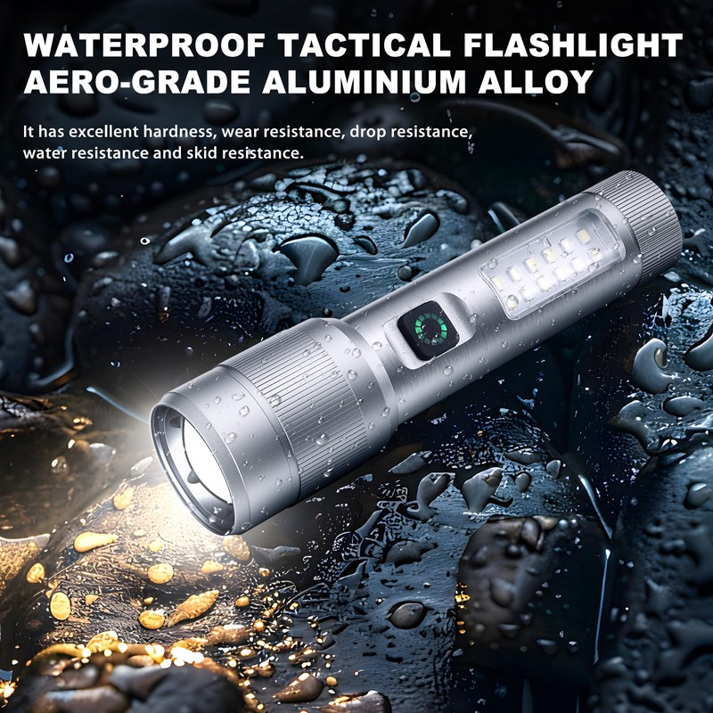 The Super Bright LED Rechargeable Flashlight is a powerful and versatile lighting solution, delivering up to 5000 lumens with a beam distance of 1000ft. Its zoomable function allows seamless adjustment from a wide floodlight to a focused spotlight. Featuring 7 lighting modes—High, Low, Strobe, COB white (high/low), and COB red (high/strobe)—it caters to various needs. The built-in COB sidelight provides hands-free illumination, perfect for repairs, emergencies, or outdoor activities like camping and hiking. Crafted from durable aircraft-grade aluminum alloy, it’s waterproof (IPX6), shockproof, and anti-slip, ensuring reliability in harsh conditions. With a lanyard and pocket clip for easy portability, this flashlight offers up to 12 hours of runtime and fast Type-C charging, making it an essential tool for home, outdoor, or emergency use.