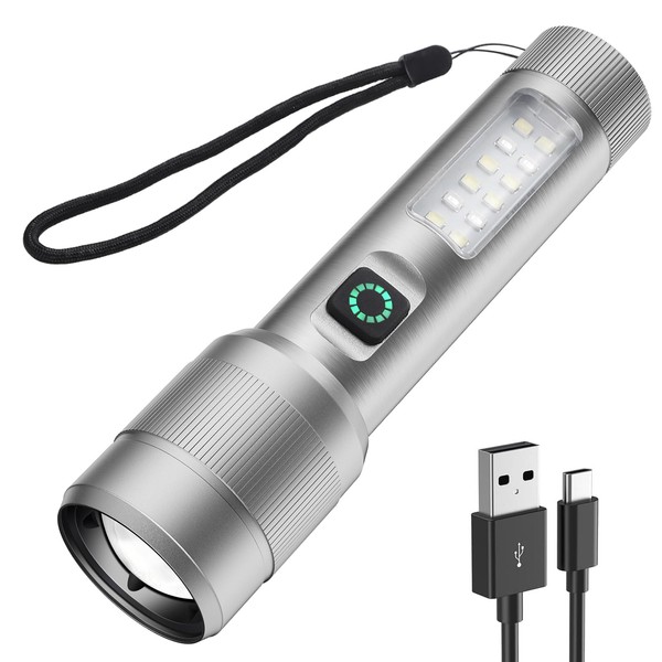 • 【LED FLASHLIGHT WITH COB SIDELIGHT】 Rechargeable LED flashlight designed with a powerful COB sidelight. combine with COB sidelight for a larger area illumination, Rechargeable Flashlight could totally let you hands free when you need do some repair working at night, Use as an emergency flashlight for car inspections or power outages. And very suitable for home, camping, hiking, outdoor or emergency situations. etc