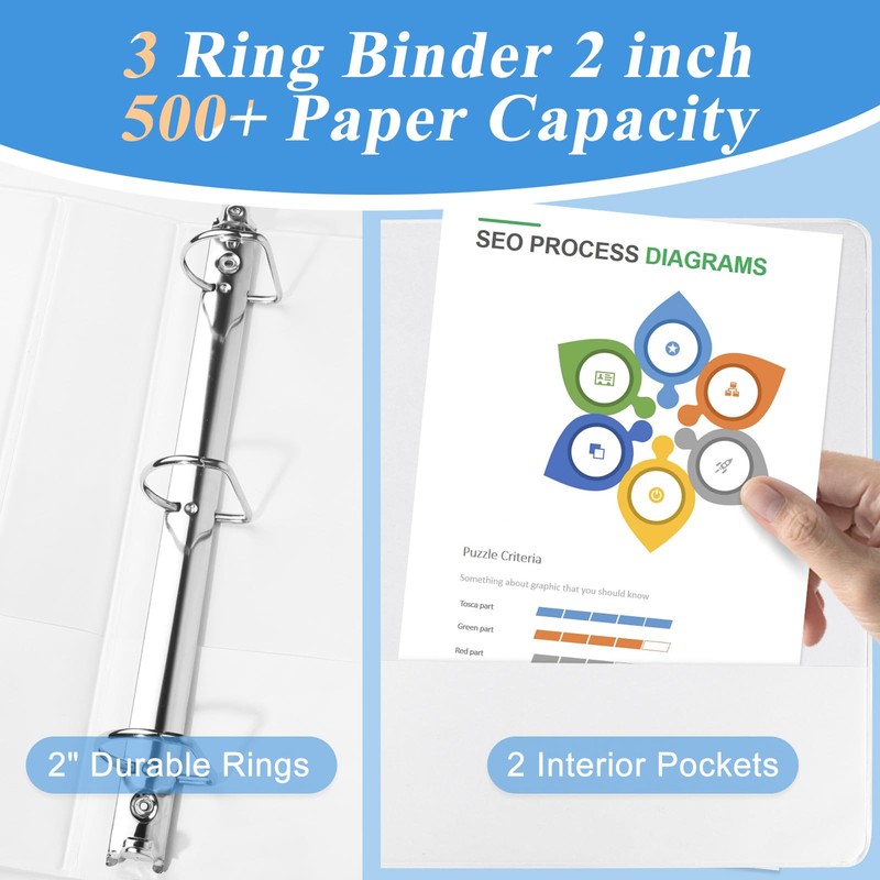 - 2" white binders hold us Letter size 8-1/2" x 11" paper, d ring can hold 500+ paper capcity, 6 packs.