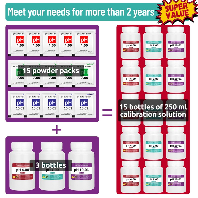 - Portable Packaging: CIZTADA 15-pack pH Calibration Powder Kit contains 5 packs of pH 4.00, 5 packs of pH 7.00, and 5 packs of pH 10.01 buffer powders. Each set comes with 3 high-quality airtight bottles for easy preparation, long-term storage, and reuse.
