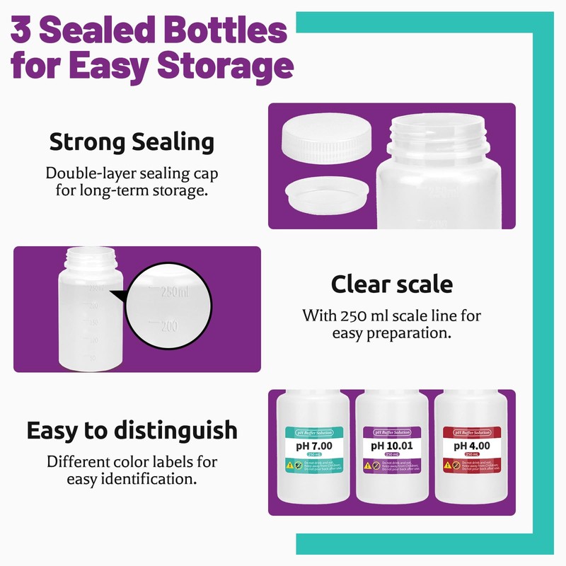 - Simple solution preparation: Simply pour the pH powder into the bottle, add 250 ml of distilled water, and shake until completely dissolved to calibrate. Three sealed bottles with labels are easy to identify, and their leak-proof design makes it easy to store solutions for the next calibration need.