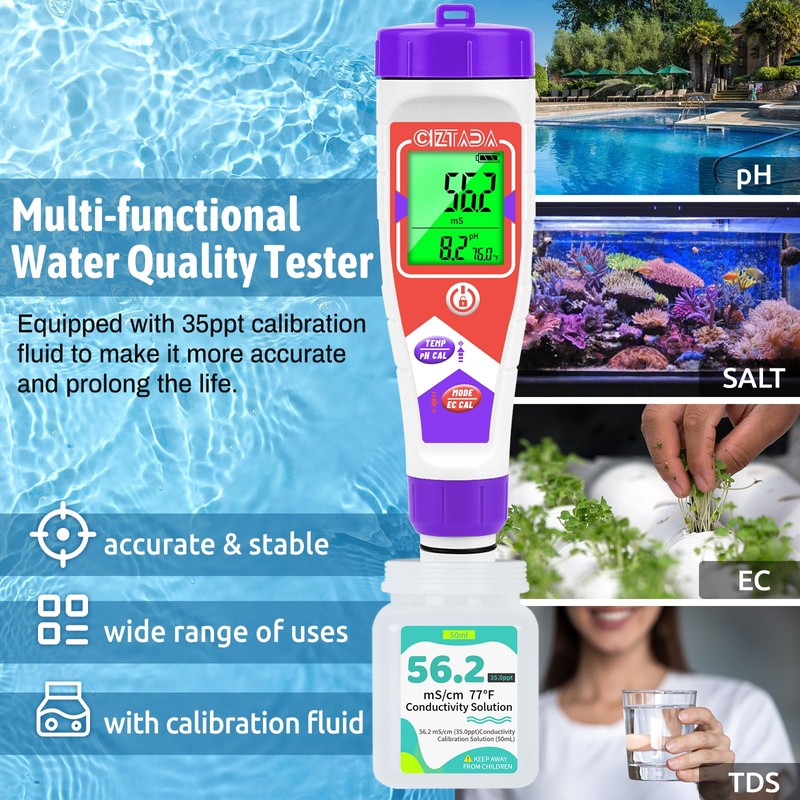 CIZTADA Saltwater Aquarium Salinity pH Tester for Reef Aquarium Digital Pool Salt Tester with 35ppt Calibration Solution Measure pH Salt EC TDS Temp 0-150ppt Large Range Salt Meter for Pool, Koi Pond