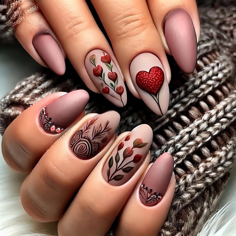 24Pcs Press on Nails Medium Almond Nails Flower Love Heart Design Acrylic Nails Suitable for Women Daily Manicure Decorations