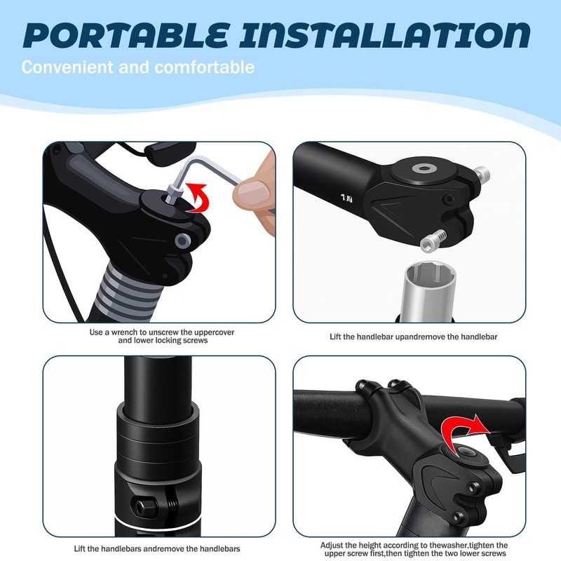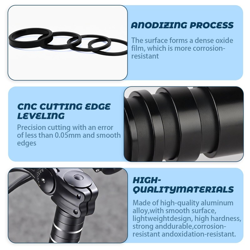 - HOCHWERTIGES MATERIAL – Das Fahrrad Vorbau Spacer Set besteht aus robuster Aluminiumlegierung, die leicht, korrosionsbeständig und langlebig ist. Perfekt für langfristige Nutzung ohne Rost oder Verschleiß.