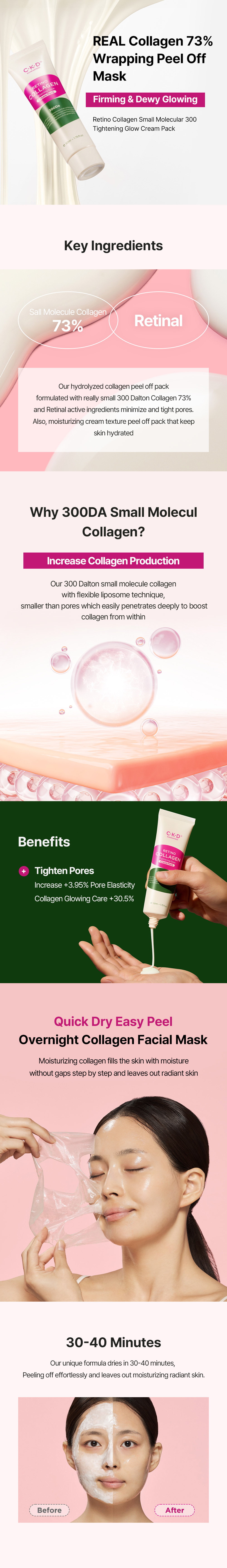 Contains 300Da low molecular collagen and retinal as vitamin A derivative to give synergic effect. Contains hyaluronic acid and elastin to hold low molecular collagen.