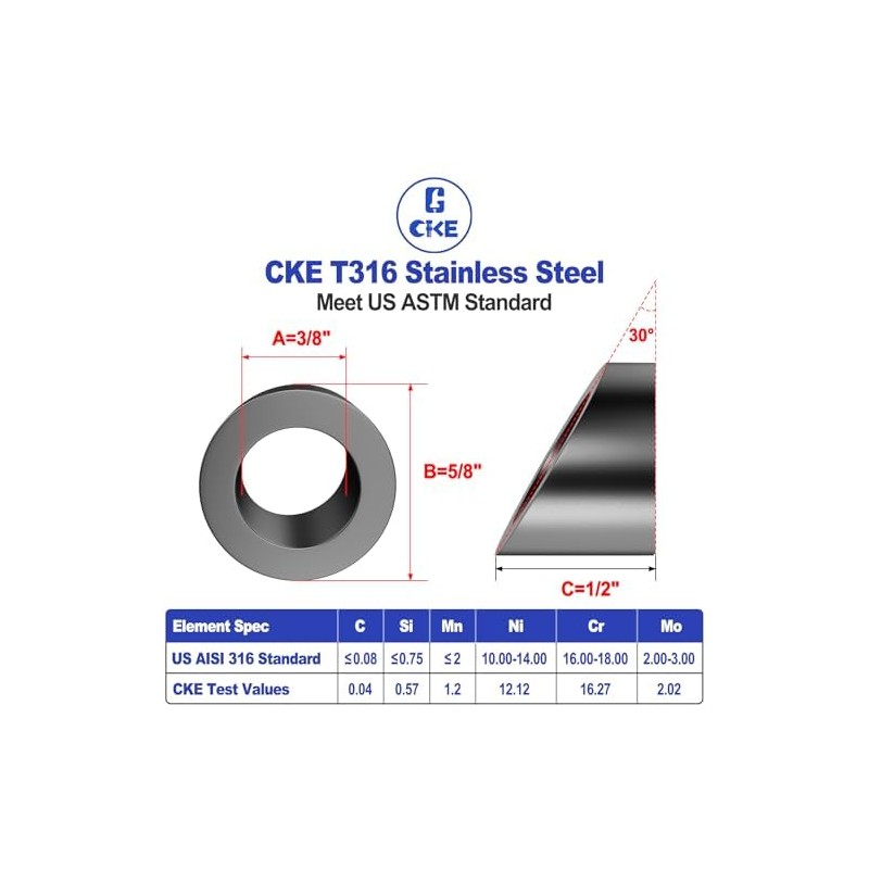 - Premium Material: CKE cable railing beveled washer are made of marine grade T316 stainless steel material. Making CKE stainless steel angle washers suitable for coastal installations as well as in places where rust resistance is important. These cable railing stainless angle washers have strong resistance to rust and corrosion, and extreme weathers. Our cable railing angled washers can serve for long time with hardly any maintenance.