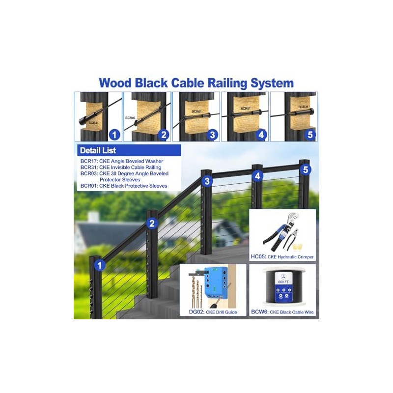 - Package List & CKE Black Cable Railing System Suggestion: You will get 50 pack uniform in shape and size angle beveled washer. Build a cost-effective black cable railing hardware system suggestion - Hydraulic Crimper: CKE HC05. Invisible Cable Railing: CKE BCR31. Drill Guide: CKE DG02. Black Level Protector Sleeve: CKE BCR01. Black Cable Wire: CKE BCW6. 30 Degree Rubber Grommets: CKE BCR30.