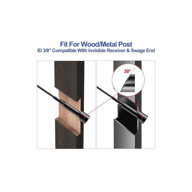 - Consistent Size & Easy to Install: our black angle beveled washer is super easy to install. Even beginners can install the angle washer easily. These stair angled washer has sturdy structures that keep not get deformed. Saving your installation and made all the difference. The angle cable railing beveled washer size: Inside diameter is 3/8", Outside diameter is 5/8". This angle washer suitable for Invisible Receiver & Swage End and 1/8", 5/32", 3/16" cable railing posts.