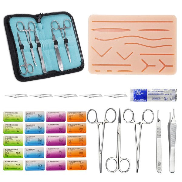 - BEST SUTURE PRACTICE KIT - CKlovzin complete Suture Practice Kit includes everything you need to practice the technique of suturing. This comprehensive kit includes all the essential tools: Regular Suture Pad, Hegar Needle Holders, Adson Forceps, Suture Scissors, Scalpel Blade Handle, Scalpel Blades (5-pack), Suture Thread (20-pack), and Convenient Carry Bag. This product is for demonstrational and educational purpose only.