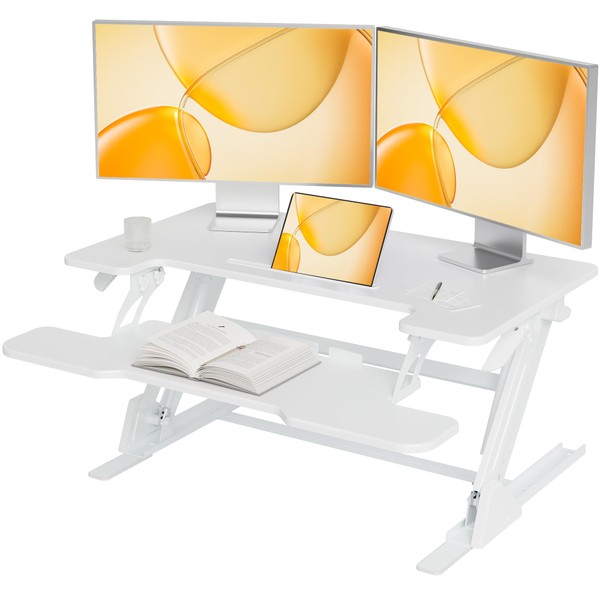 Claiks Standing Desk Converter 36 inch, Height Adjustable Sit Stand Up Desk Riser, Quick Sit to Stand Tabletop Dual Monitor Riser Workstation for Home Office with Keyboard Tray, White